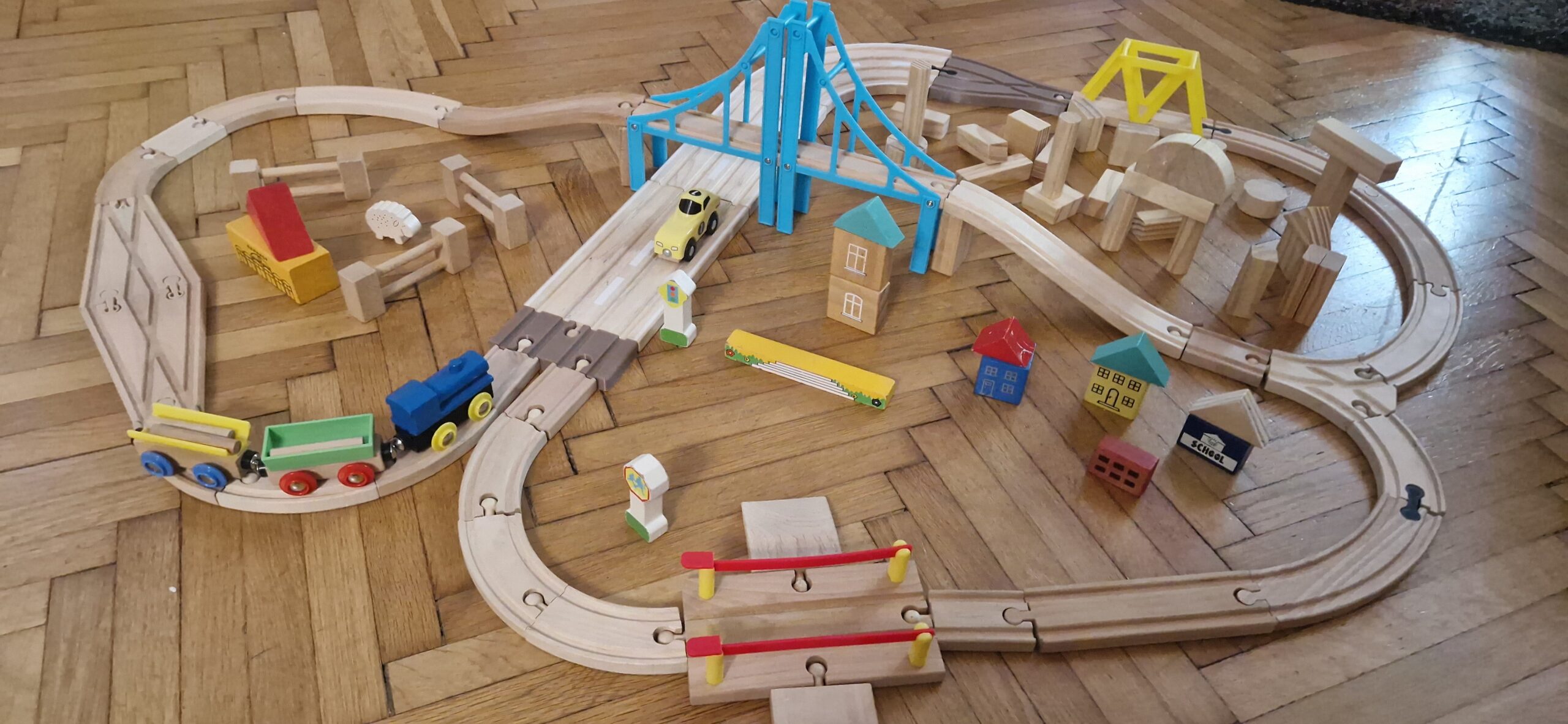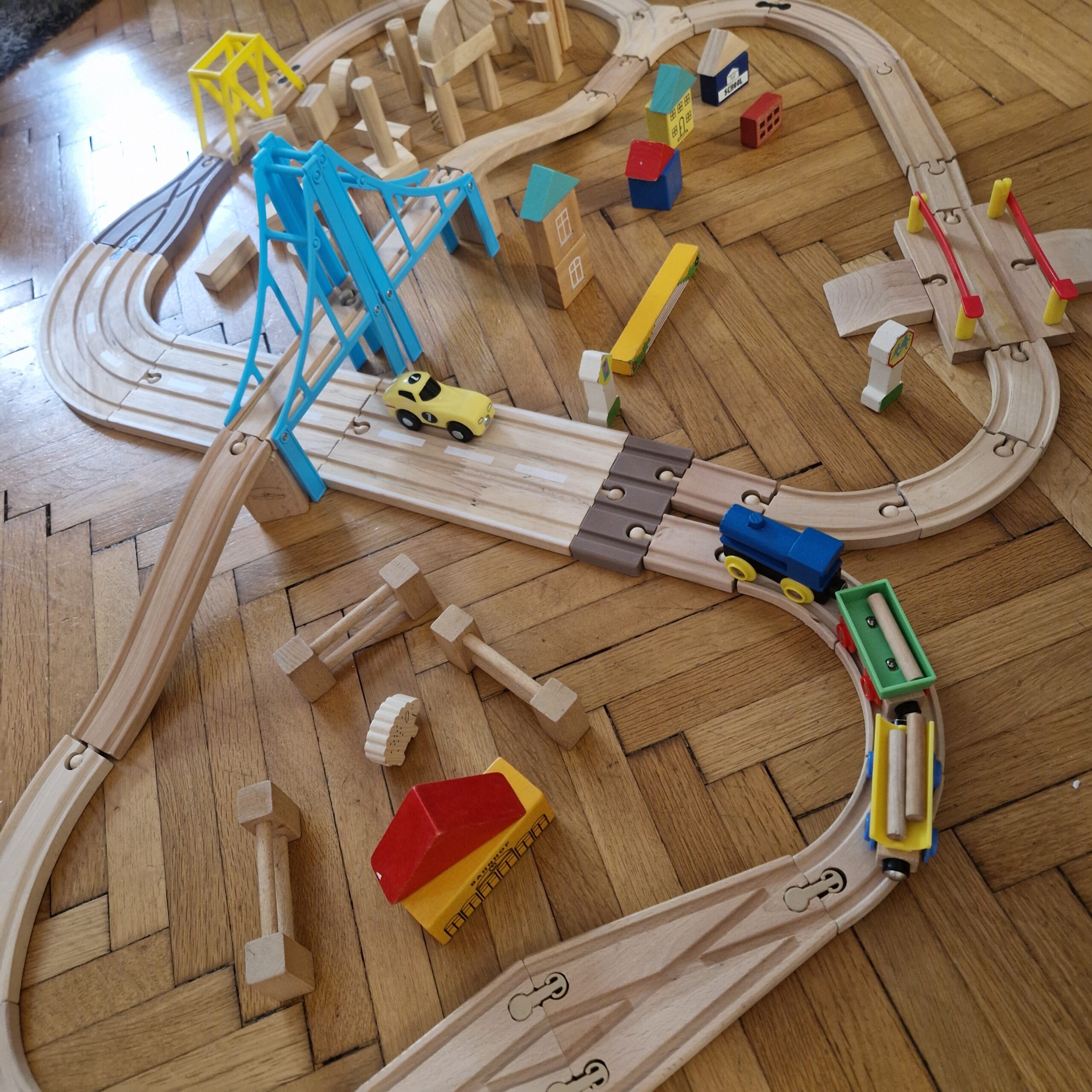 Nagy egyedi pályakombináció SIHU adapterek segítségével kombinált fa autópálya és vonatpálya egyben. Két híddal, sok-sok kiegészítővel, tehervonattal, sorompókkal, építőkockákkal.