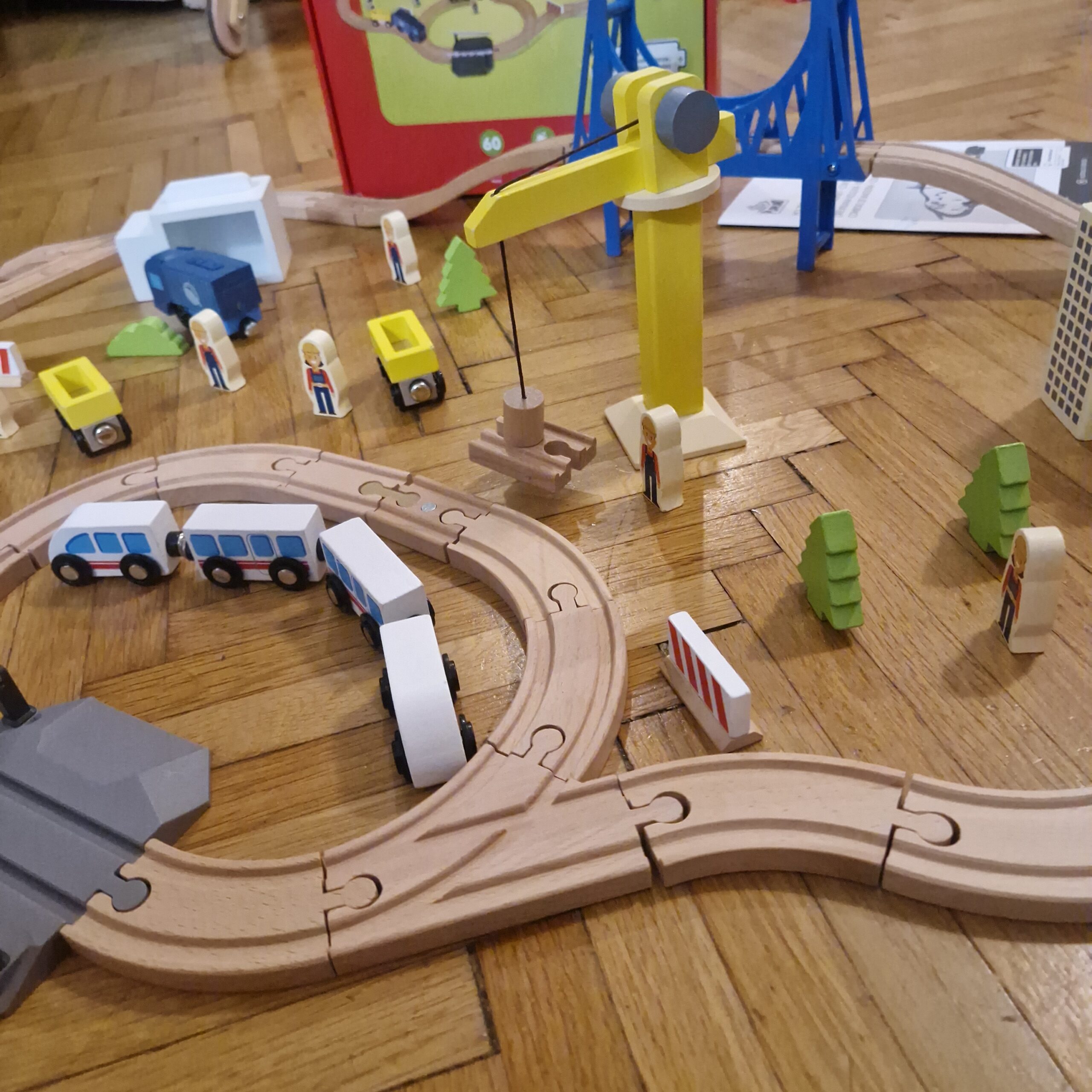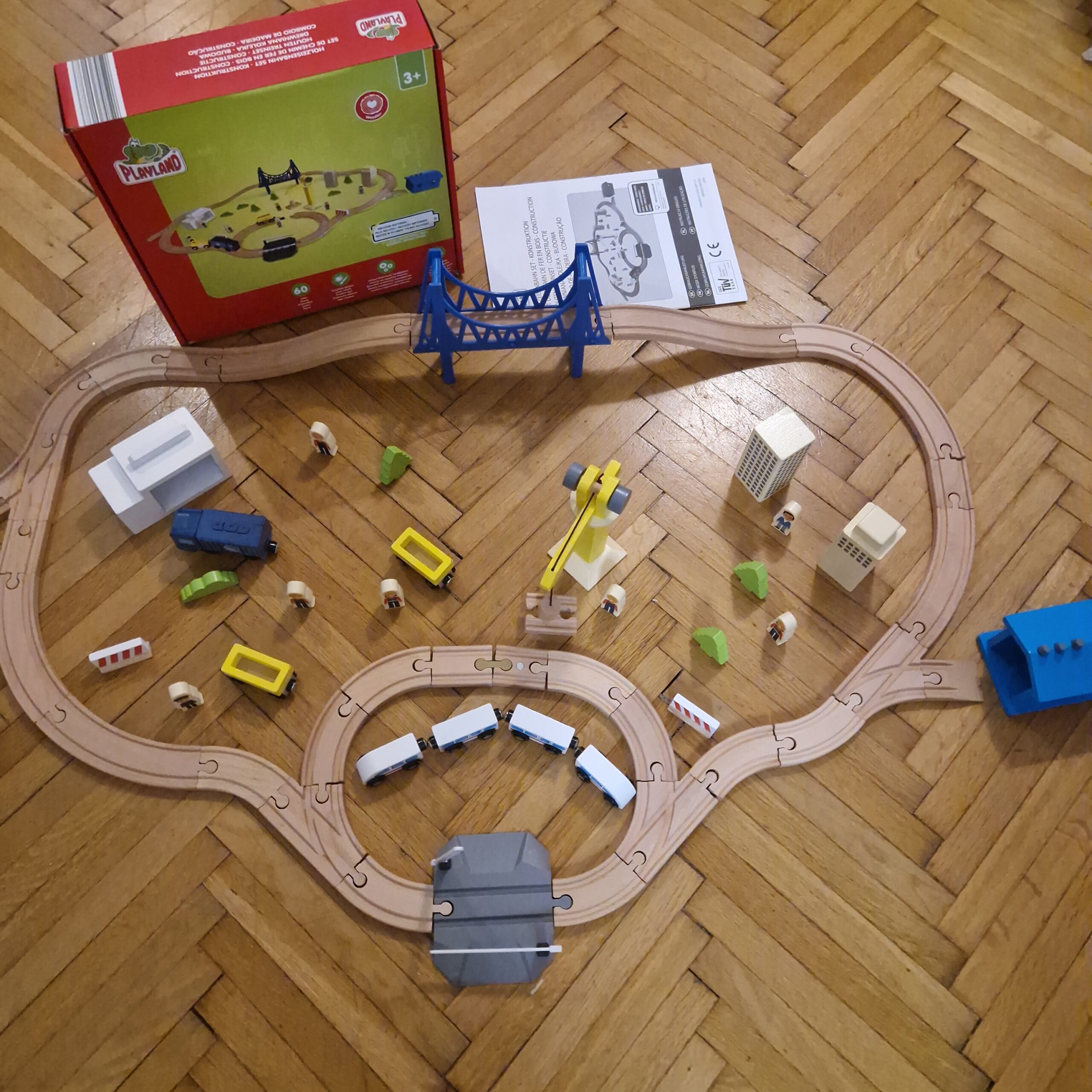 A képen látható szuper városi pálya sok kiegészítővel, daruval, elektromos kis teherautóval. Dobozában, négy darabos kisvonatszettel, sok kiegészítővel.