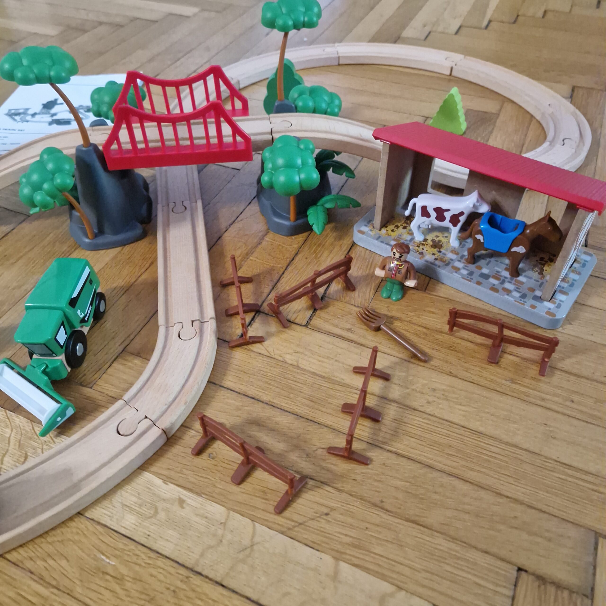 Farm vonatpálya kombájnnal, elektromos kistraktorral, dobozában.