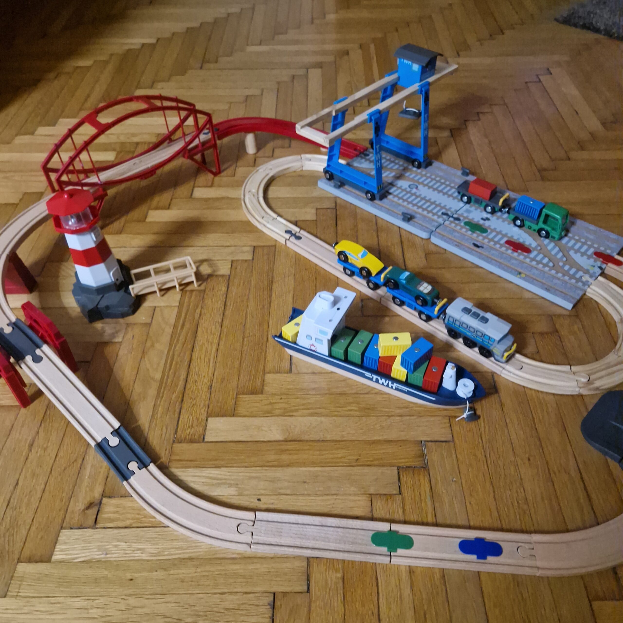 Fantasztikus kikötő pályaszett, kerekes daruval, kishajóval, rengeteg kiegészítővel. Világítótorony fényefektussal, a kisvonat USB-n tölthető, a színes elemekre interaktív reagál.