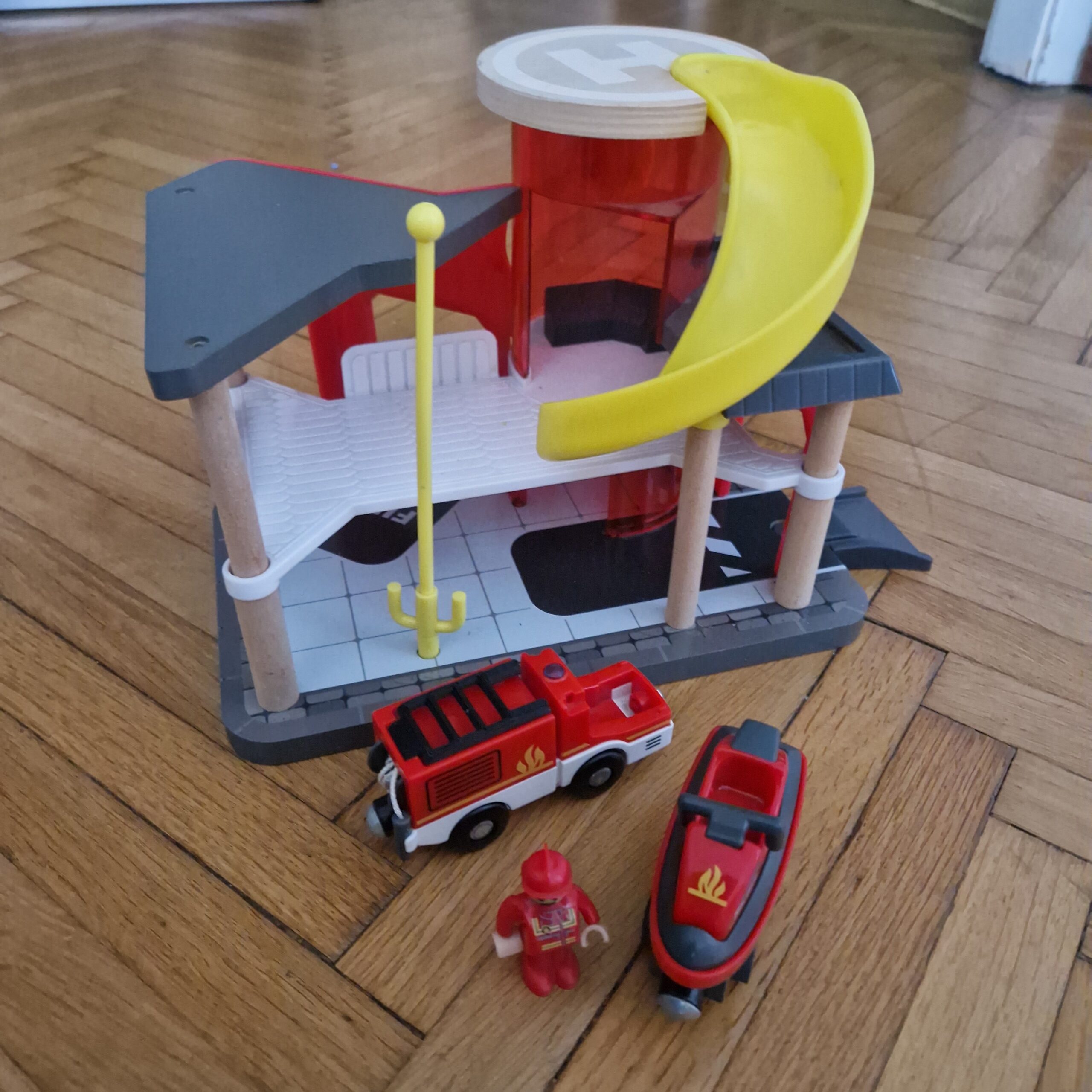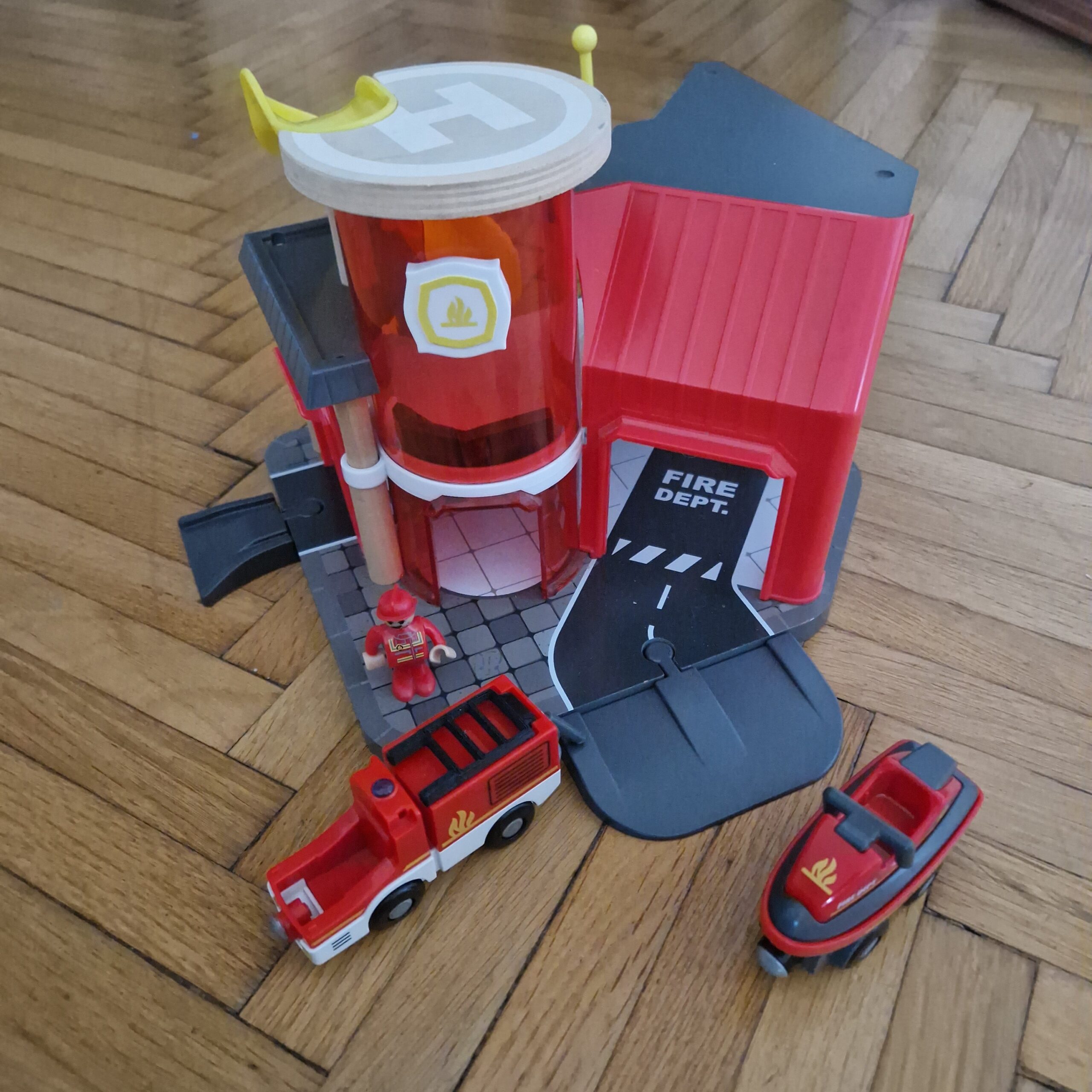 Szuper pályakiegészítő. Tűzoltó állomás csúszdával, figurával, járművekkel, minden képen látható elem.