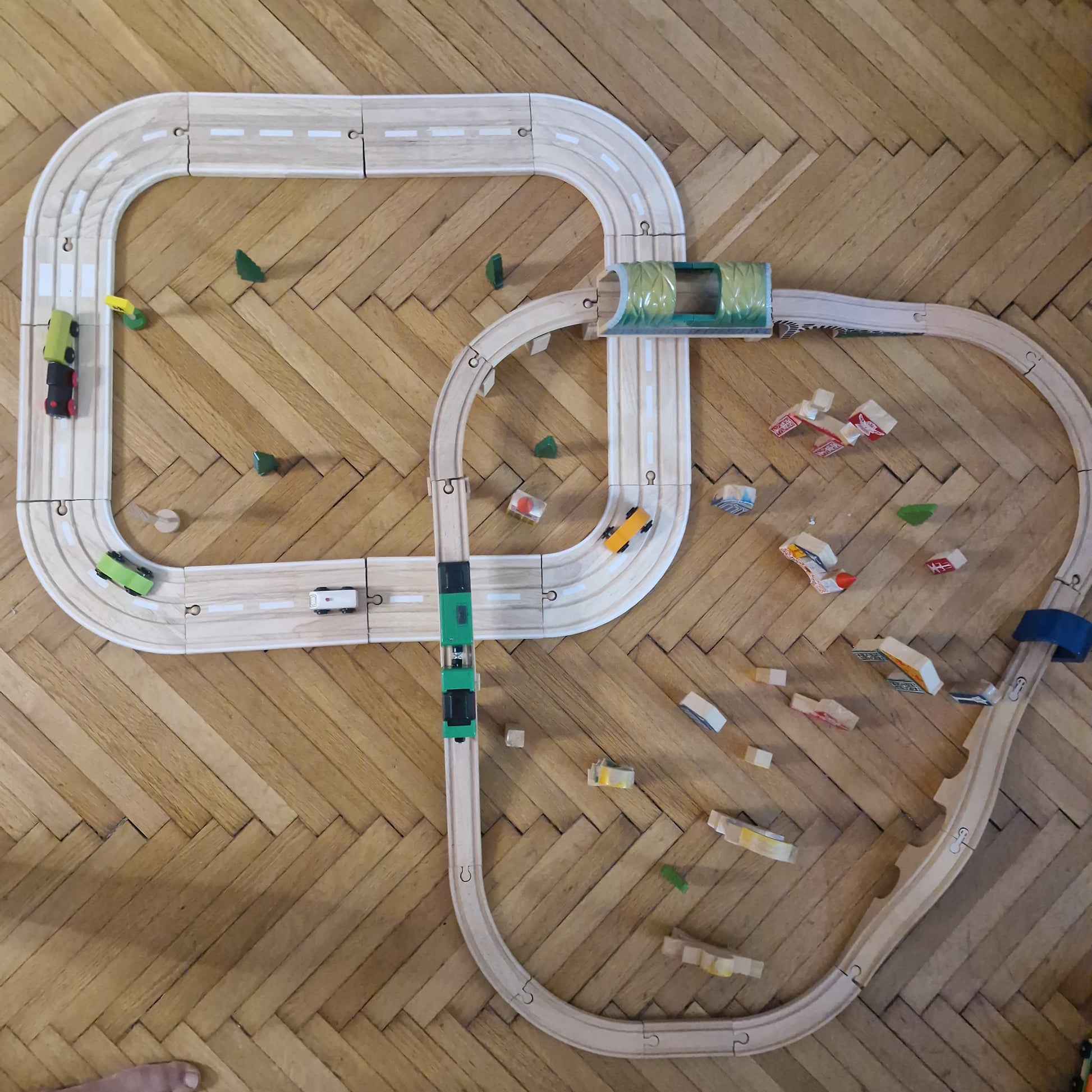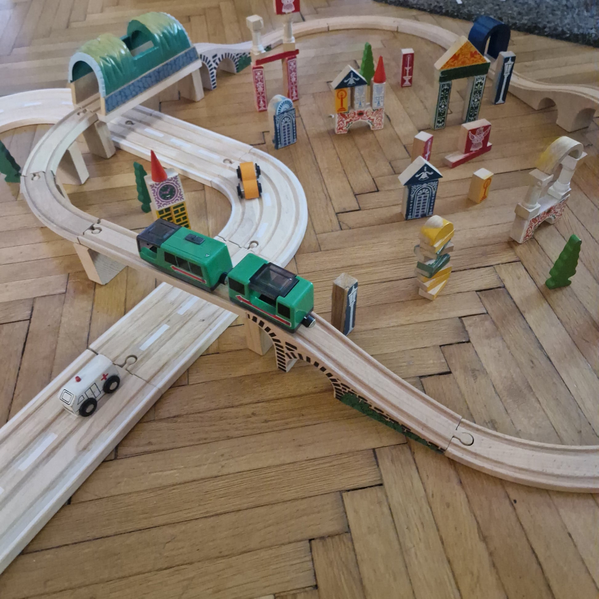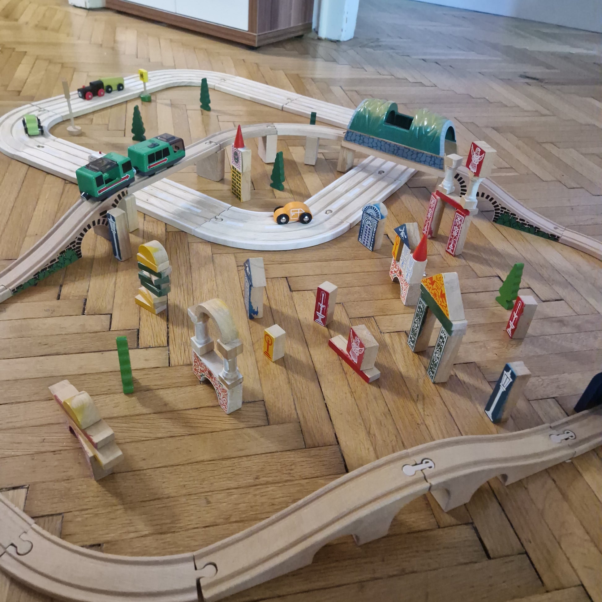 Hatalmas egyedi vonatpálya és autópálya kombináció. Használt játék, használatból eredő sérülés, kopás előfordulhat. Rengeteg kiegészítővel, építőkockákkal, elektromos kisvonattal, minden képen látható tartozékkal.