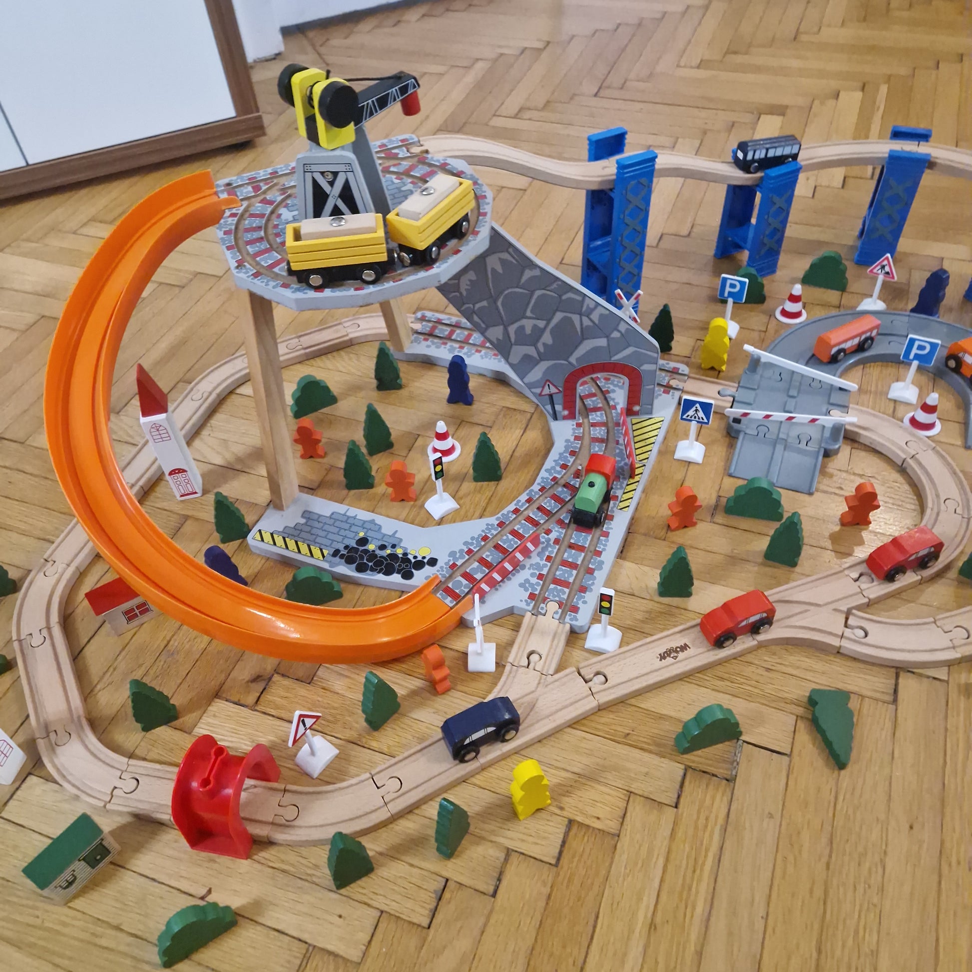 Óriási különleges vonatpálya rengeteg kiegészítővel. Használt játék, használatból eredő sérülés, hiány előfordul, a narancssárga csúszda teteje sérült, a játékot, összeépítést nem befolyásolja, a sínek alja kézzel számozott. A képeken látható állapotban! Sok sok kisautóval, kisvonattal, daruval.